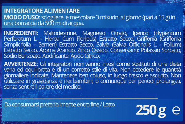 INGREDIENTI: Maltodestrine, Magnesio Citrato, Iperico (Hypericum Perforatum L. - Herba Cum Floribus) Estratto Secco, Griffonia (Griffonia Simplicifolia – Semen) Estratto Secco, Salvia (Salvia Officinalis L. - Folium) Estratto Secco, Aroma Arancio, Zinco Ossido. Conservanti: Potassio Sorbato, Sodio Benzoato. Acidificante: Acido Citrico.